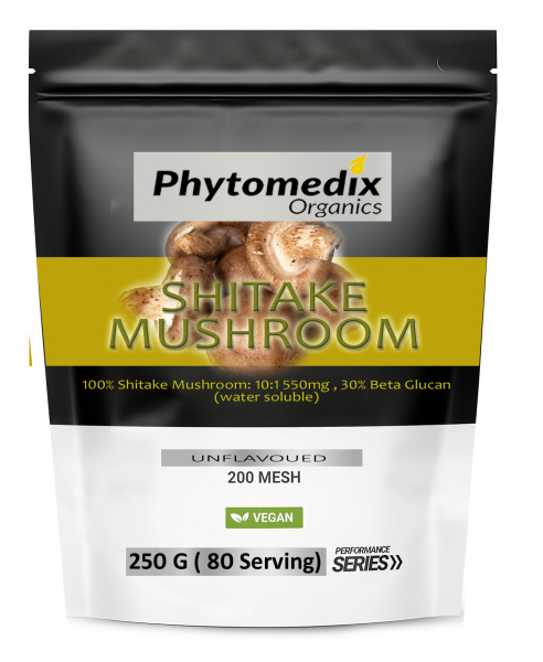 100% Shitake Mushroom: 10:1 550mg , 30% Beta Glucan (water soluble)